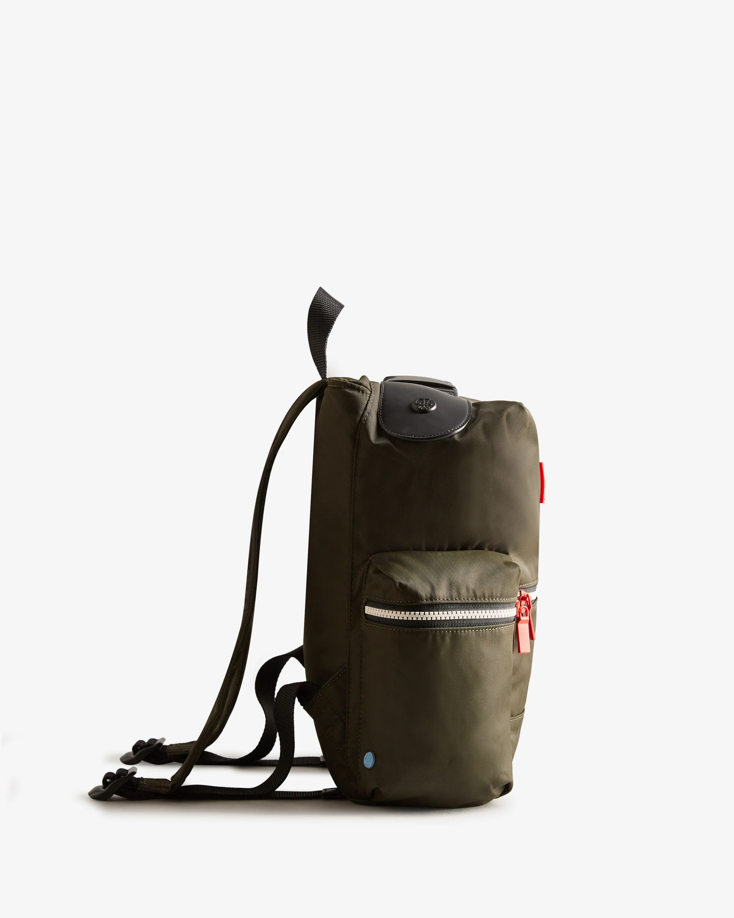 The Hunter Original Mini Nylon Top Clip is weatherproof and perfect for daily commutes and weekends away. Crafted from water-resistant nylon with a leather trim, it has a spacious interior with a 13L capacity. For extra security, it’s fitted with a parachute clip and zip closure at the top. The main body provides storage for a 12.5" laptop while the side pockets offer easy access to everyday necessities. This mini green backpack is inspired by our iconic Original Tall Wellington boot with elements like the Hunter Tri-coloured zips and padded adjustable straps, which feature our signature quilting, integrated into the design. In a classic shade, it is undeniably distinctive and true to Hunter’s DNA.