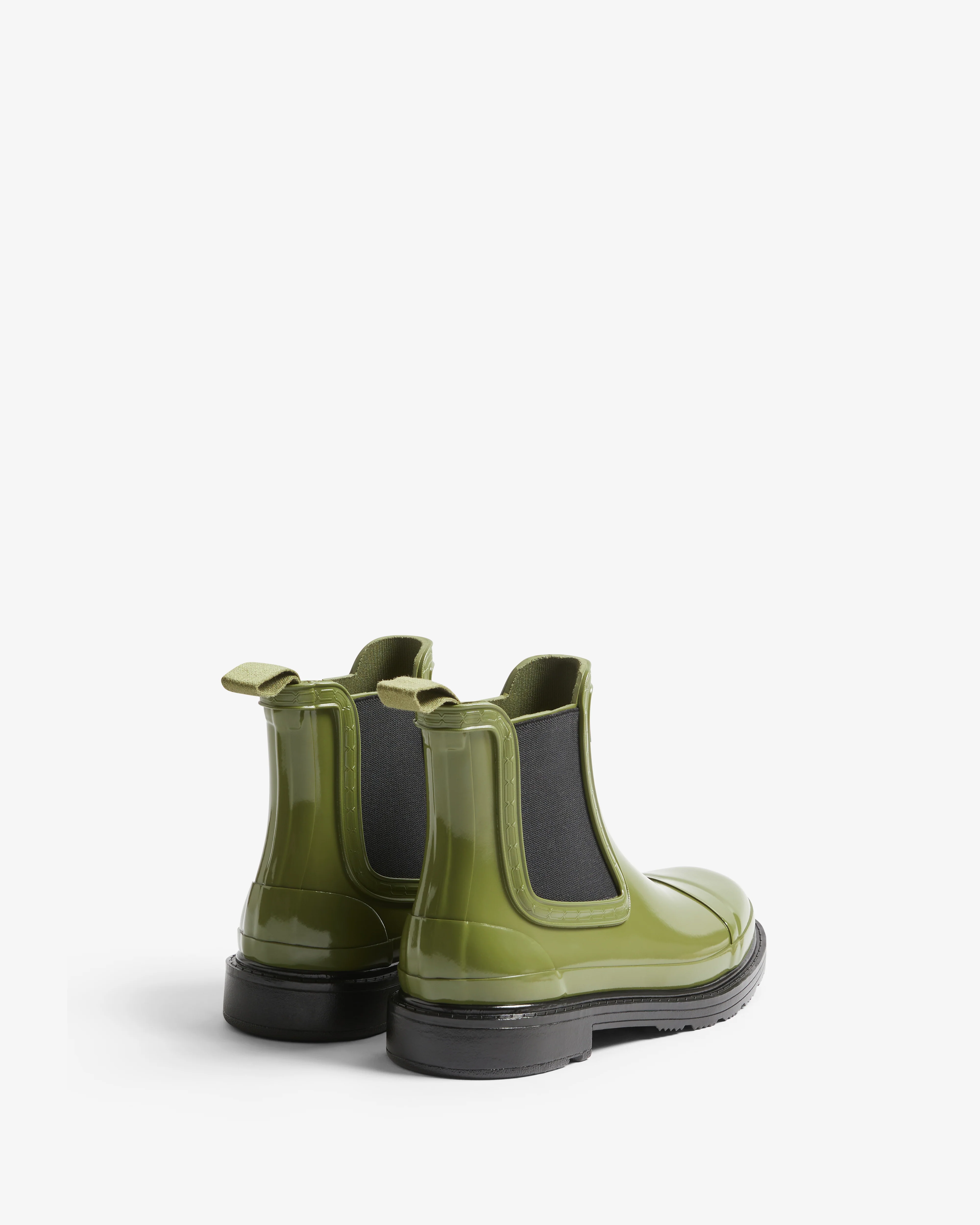 These 100% waterproof lower boots are handcrafted to strict standards to protect forests, as well as the animals and communities that depend on them. Crafted from natural FSC®-certified, vegan rubber, the 100% waterproof lower Commando Chelsea is an icon within our Original collection. Retaining all the beloved features of the Original Chelsea Boot, like the flexible gusset and Hunter grip, this new silhouette has a higher profile, reaching 15mm further up the leg. This women's green and black Chelsea boot style also features an updated recycled polyester lining and insole.